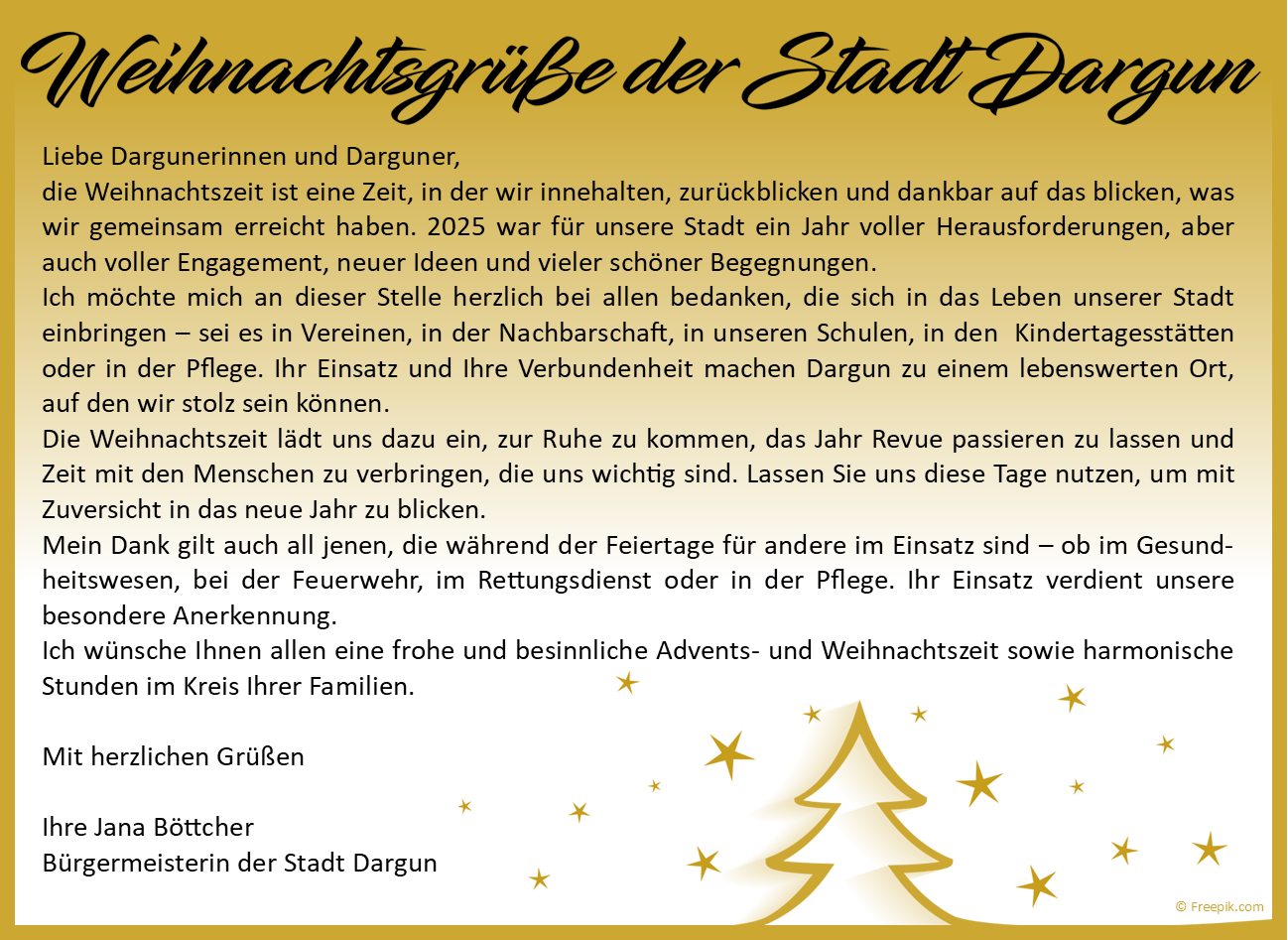 Die Stadtverwaltung Dargun bleibt vom 24.12.2025 - 04.01.2026 geschlossen. (In dringenden Fällen kontaktieren Sie bitte: 0171-2050418)