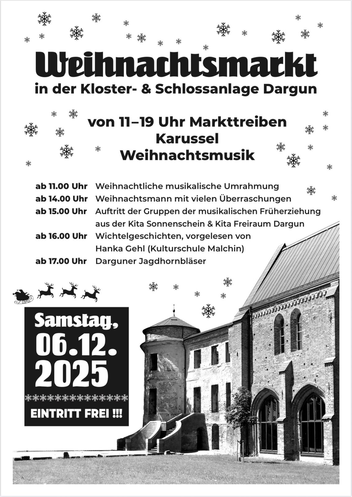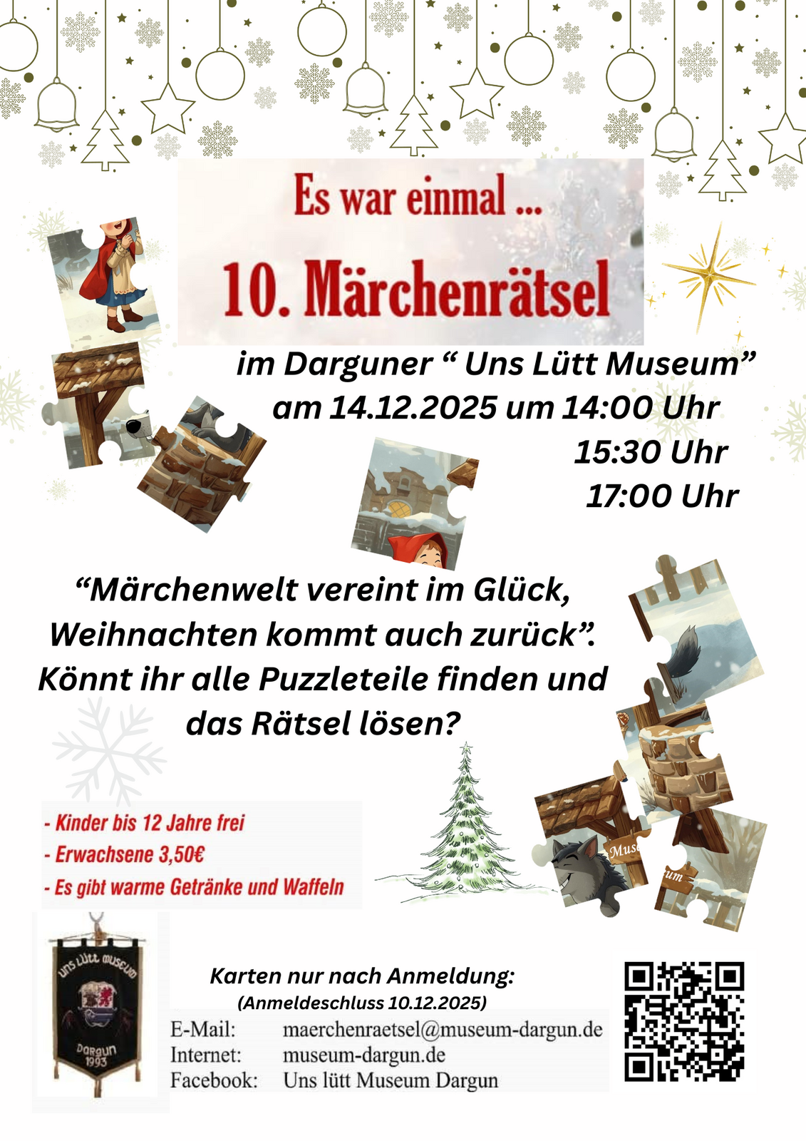 Märchen gehören seit Jahrhunderten fest zur menschlichen Kultur. Sie führen uns in wunderbare Welten, vermitteln moralische Werte und inspirieren zum Nachdenken. In einer Ära, in der der Alltag oft trist und hektisch wirkt, schenken uns diese Erzählungen eine Pause zum Träumen und Still sein. Sie erinnern daran, an Wunder zu glauben. Nicht nur die Kinder, sondern auch Erwachsene können daraus wertvolle Erkenntnisse ziehen. In diesem Jahr öffnet das Museum in Dargun bereits zum 10. Mal seine Pforten für eine Reise in die Märchenwelt. Allerdings scheint bei dieser Jubiläumsveranstaltung alles anders zu sein: Diesmal haben nicht böse Märchenfiguren den Brunnen verzaubert. Nein, viel schlimmer! In der ganzen Welt gibt es Streitereien und Unfrieden, die Weihnachten bedrohen. Es scheint, als würde das geliebte Fest, gleich einem Puzzle, in lauter Einzelteile zerfallen. Aber sicher wird es den Kindern mit Unterstützung der Märchenfiguren gelingen, dieses Puzzle wieder zusammenzusetzen und Weihnachten zu retten. Der Verein „Uns lütt Museum“ Dargun e.V. lädt am Sonntag, den 14. Dezember 2025 zum Besuch des Märchenrätsels ein. Die Teilnahme an der Veranstaltung im Museum wird zu folgenden Zeiten angeboten: 14.00 Uhr, 15.30 Uhr und 17.00 Uhr. Der Eintritt für Kinder bis 12 Jahre ist frei, während Erwachsene einen Beitrag von 3,50 EUR zahlen.